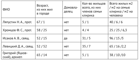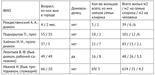 Как явствует из материалов переписи, средний размер жилой площади на одного члена семьи клирика составлял менее пяти квадратных метров. Если среди «служителей культа» и оставались владельцы собственных домов, то в результате подселения к ним дополнительных жильцов они были поставлены в равное с квартиросъемщиками положение. Для сравнения укажем, что в 1934 г. средняя жилая площадь на одного человека в поселке ВИЗ составляла 5,6 кв. м.249