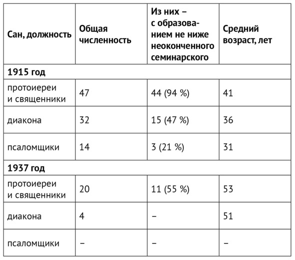 Таким образом, за два десятка послереволюционных лет произошло резкое снижение образовательного уровня городского духовенства и его существенное «постарение». При этом почти на три четверти сократилась его общая численность (в частности, осталось лишь пятеро клириков, служивших в городе с дореволюционных времен), а такая группа, как псаломщики, здесь исчезла полностью. Последнее произошло, прежде всего, из-за сокращения клириков на приходах, ввиду ухудшения экономического положения последних. Кроме того, в результате массового закрытия церквей появилось большое количество «лишних» священников, которые стали выполнять, в том числе, и причетнические обязанности.