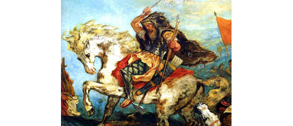 Гуннский вождь Аттила против римского полководца Аэция. Римляне с германцами стали одерживать верх, и случилось так, что не ведающие до того поражения гунны, дрогнули и заколебались. Тогда Аттила с пламенной речью обратился к войску: