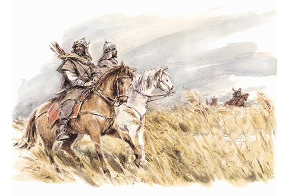 «Невысокие, кривоногие, они обладали, тем не менее, могучими плечами. Их руки с детства привыкли держать копье и меч, аркан и лук. Они проводят всю свою жизнь в дороге, изредка разбивая свои шалаши из кож. У них нет отчизны, они не ведают, откуда они, на какой земле родились».