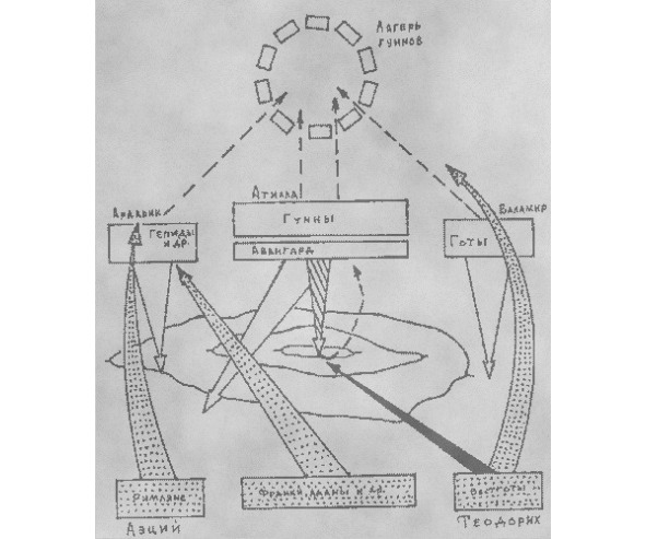 Пока у гуннов шли мероприятия по обороне лагеря, Аэций держал совет со своими военачальниками. Он хорошо знал как готов, своих союзников в этой битве, так и гуннов, своих врагов. Недаром ведь 20 лет провел он у них заложником. Он утверждал, что гунны не так опасны для Рима, как готы, ибо не принимают римского образа жизни. Отбитые, они вернутся в свою степь. А вот готы, вкусившие блага цивилизации, после уничтожения гуннов, станут непреодолимой силой. Не уйдут, так как их очень много. Они, потеряв главного противника, беспрепятственно расселятся на всех землях Империи и создадут более опасную угрозу Риму. Поэтому, к всеобщему удивлению, Аэций дал гуннам беспрепятственно уйти за Рейн. В дальнейшем он надеялся использовать их в борьбе против ненасытных германцев.