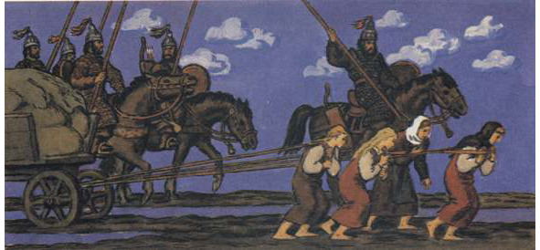 Эти обры воевали и против славян и притесняли дулебов – также славян, и творили насилие женам дулебским: бывало, когда поедет обрин, то не позволял запрячь коня или вола, но приказывал впрячь в телегу трех, четырех или пять жен и везти его – обрина, – и так мучили дулебов. Были же эти обры велики телом, и умом горды, и Бог истребил их, умерли все, и не осталось ни одного обрина. И есть поговорка на Руси и доныне: «Скинули как обры», – их же нет ни племени, ни потомства…»