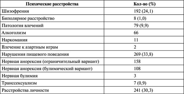 Из историй болезни пациентов (независимый диагноз психиатра) была получена информация о наличии у некоторых из них следующих психических заболеваний: шизофрении, нервной анорексии (ограничительный вариант), булимического расстройства (как самостоятельное заболевание и вариант или этап в развитии нервной анорексии) и алкоголизма, а также дисморфофобического расстройства тела (в рамках нервной анорексии). Психические заболевания были диагностированы психиатрами с помощью ранее валидизированной Международной статистической классификации болезней и проблем, связанных со здоровьем (МКБ-10, 1994) [66], которая в части описания психических расстройств, в свою очередь, была создана на основе «Руководства по диагностике и статистике психических расстройств» (DSM-IV, 1994), разработанного американской ассоциацией психиатров.