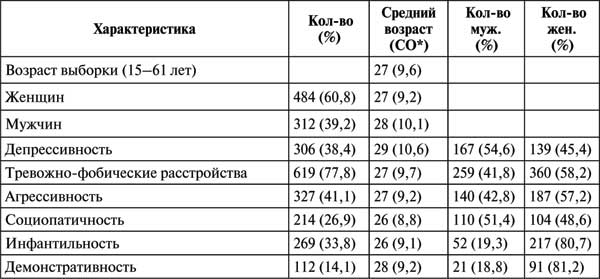 Из более двух тысяч обследованных пациентов для анализа было отобрано 796 человек. Выборка производилась на основании следующих критериев. Первый критерий – возраст пациентов не моложе 15 лет. Второй критерий – образование не ниже среднего (за исключением 28 пациентов, которые были старшеклассниками). Третий критерий – отсутствие в психическом статусе пациентов признаков органической деменции. Четвертый критерий – экспериментальные данные, полученные при изучении эмоционально-личностной сферы пациентов с помощью MMPI должны быть достоверны и явно не противоречить результатам, полученным по другим личностным тестам и данным клинического исследования. Первый критерий был продиктован поставленной задачей, а именно исследовать этой методикой не детей, характеризующихся «естественной» незрелостью эмоционально-личностной сферы, а взрослых пациентов. Второй критерий исходил из того, что для выполнения основных для данного анализа методик (MMPI и методики «Несуществующее животное»), особенно для MMPI, требуется наличие у испытуемого достаточно высокого уровня психического и интеллектуального развития. Включенные в выборку старшеклассники, по мнению автора, обладали таким уровнем развития. Третий критерий определился эмпирически, вследствие недоступности для пациентов с признаками органической деменции выполнения методики MMPI. Четвертый критерий был установлен в соответствии с принципами клинической диагностики эмоционально-личностной сферы. И последнее, поскольку экспериментальный материал собирался в течение многих лет, то в выборку не вошли также пациенты, в протоколах которых отсутствовали формальные данные об их возрасте и образовании.