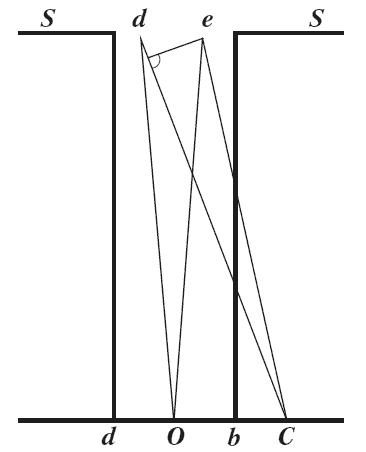 Рис. 3 дает представление о том, как образуются вышеупомянутые полоски. Согласно теории волн, щель, заполненная светом, действует как само светящееся тело. Представим себе, что из света, падающего на щель SS, взяты точки, e и d, тогда пути света по do и по ес будут иметь одинаковую длину; в точке О попадут одно на другое, подъем волны на подъем, понижение на понижение, и количества света сложатся.