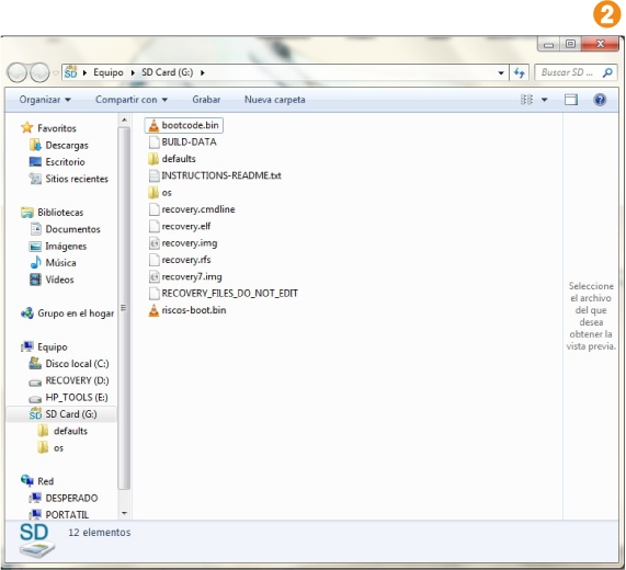 2. Descomprimir y copiar el contenido del archivo en una tarjeta SD formateada (ver capítulos 8 y 9).