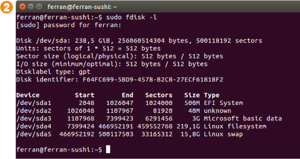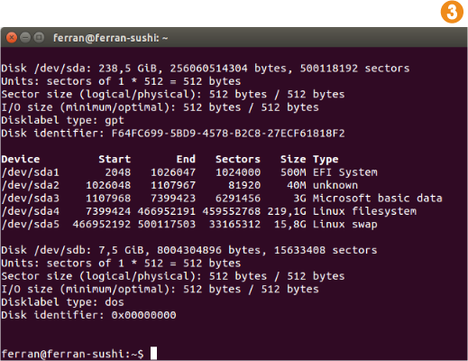 1. Lo primero que deberemos hacer es encontrar el dispositivo que asigna nuestro sistema a la tarjeta SD/micro-SD. Para hacerlo, ejecutaremos el comando sudo fdisk -l antes de introducir la tarjeta, y repetiremos el proceso después de hacerlo. Para localizar nuestro dispositivo deberemos observar las diferencias entre las dos salidas 2 3.