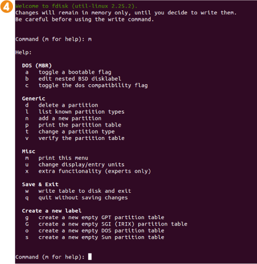 4. Utilizaremos el comando d para borrar las particiones de la tarjeta una a una. Para conocer las particiones de la misma, usaremos el comando p. Con el comando m, en cambio, podremos ver todas las opciones de fdisk 4.