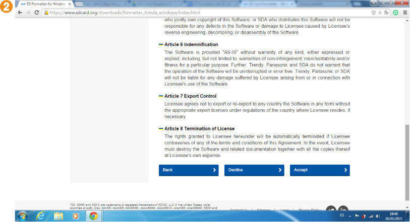 3. Escogeremos la versión a descargar 1 de la aplicación SD Card Formatter, según sea nuestro sistema operativo (Windows o macOS X), y aceptaremos los términos de la licencia para poder descargarla 2.