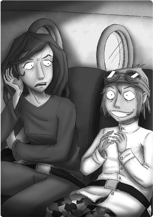 Inside the passenger compartment, the boy amusedly watched the girl who was having a lot of trouble settling in her seat. Despite the fact that the plane had far fewer passenger seats than a normal flight, Fade banged into everything; furthermore, she clumsily hit the flight attendants who tried to help her to her seat with her hairdo.