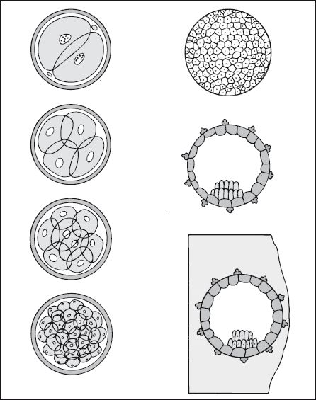 Ядро клетки начинает делиться, увеличиваться в размерах, а сама клетка «сползает» вниз в матку, где продолжает развиваться. Через неделю после зачатия (на 21—23-й день менструального цикла) оплодотворенное яйцо плотно закрепляется на задней стенке матки ближе к верху и продолжает свой рост.
