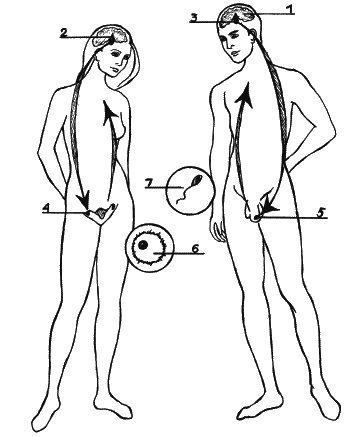 1 – мозг; 2 – гипоталамус; 3 – гипофиз; 4 – яичники; 5 – яички; 6 – яйцеклетка; 7 – сперматозоид.