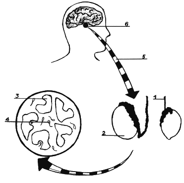 1 – семенной канал; 2 – яички; 3 – развивающийся сперматозоид; 4 – зрелый сперматозоид; 5 – ЛГ, ФСГ; 6 – гипофиз.