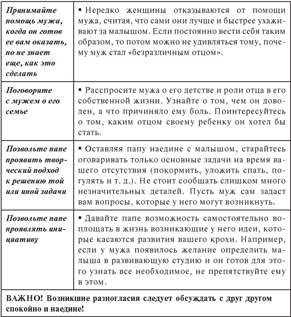 Полезные подсказки для обоих молодых родителей• Разделите обязанности по уходу за малышом и домашние дела. Не стоит все «нагружать» на маму.