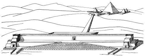 Тело умершего фараона привозили в нижний храм, чтобы омыть и очистить его; затем оно подвергалось различным процессам мумификации. Ученые доказали, что в эпоху Четвертой династии в этом храме проходили три важные церемонии. Первая из них – омовение и очищение тела. Этот ритуал продолжался недолго. Второй – мумификация – длился гораздо дольше. (В гробнице одной из цариц в Гизе засвидетельствовано, что между ее кончиной и погребением прошло 272 дня.) Третья церемония, именовавшаяся «Отверзание уст», исполнялась после завершения мумификации в день погребения. Это был магический обряд, предназначенный для того, чтобы тело снова смогло говорить и пользоваться приношениями в другой, намного более важной жизни, которая должна была начаться после смерти.