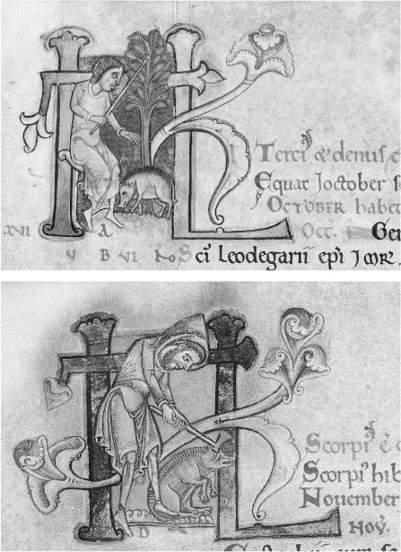 Рис. 1.4, 1.5. Календарь из Сент-Олбанса: начальные буквы как иллюстрации к октябрьским и ноябрьским трудам