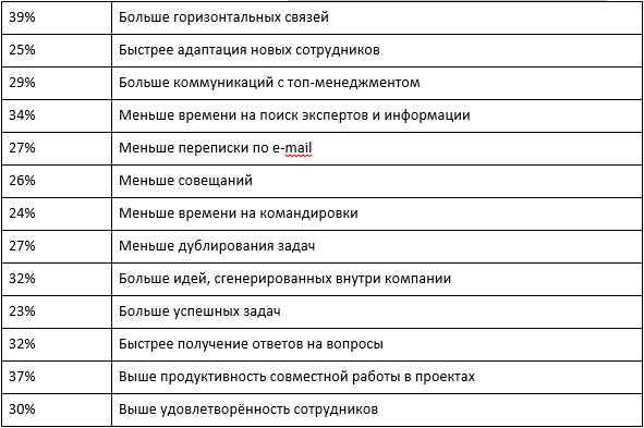 На «локальном» уровне при увеличении зрелости СУЗ, компании получают следующие результаты (по данным компании Yammer, Inc.):
