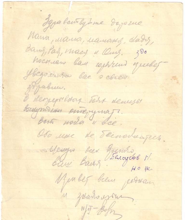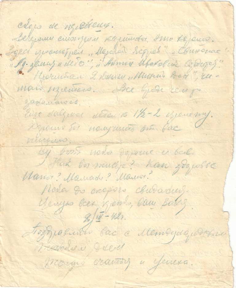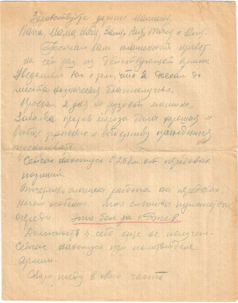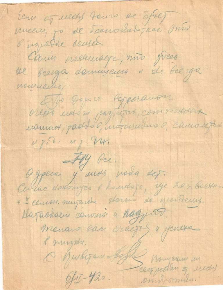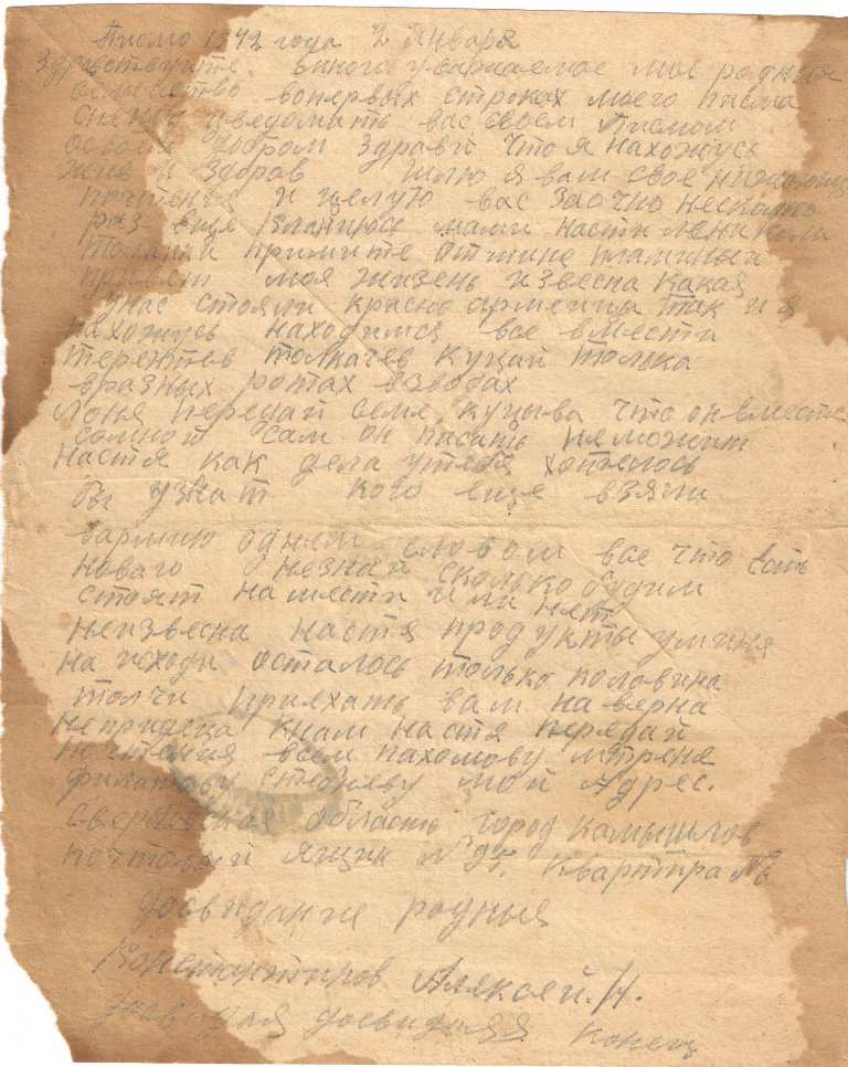 Писмо 1942 года 2 января Здравствуйте много уважаемое мое родное семейство вопервых строках моего писма спешу уведомить вас своем писмом освоем добром здрави Что я нахожусь жив и здоров Шлю я вам свое нижающе почтение и целую вас зао чно несколко раз Еще кланиюсь мами насти лени коли толинки примите от мине пламиныи привет моя жизень извесна какая унас стоят красно армеицы так и я нахожусь находимся все вместе Терентьев Толкачев Куцай толька в разных ротах взводах Лоня передай семе куцыва что онвместе сомной сам он писать неможет Настя как дела у тебя хотелось бы узнат кого еще взяли вармию одним словом все что есть нового не знай сколько будим стоят на мести или нет неизвесна Настя продукты уминя на исходи осталось только половина толчи приехать вам на верна непридеца к нам Настя передай почтения всем пахомову матрене филатову стебневу мой адрес. Сверловская область город Камышлов почтовый ящик №95 квартира №6 До свидание родные
