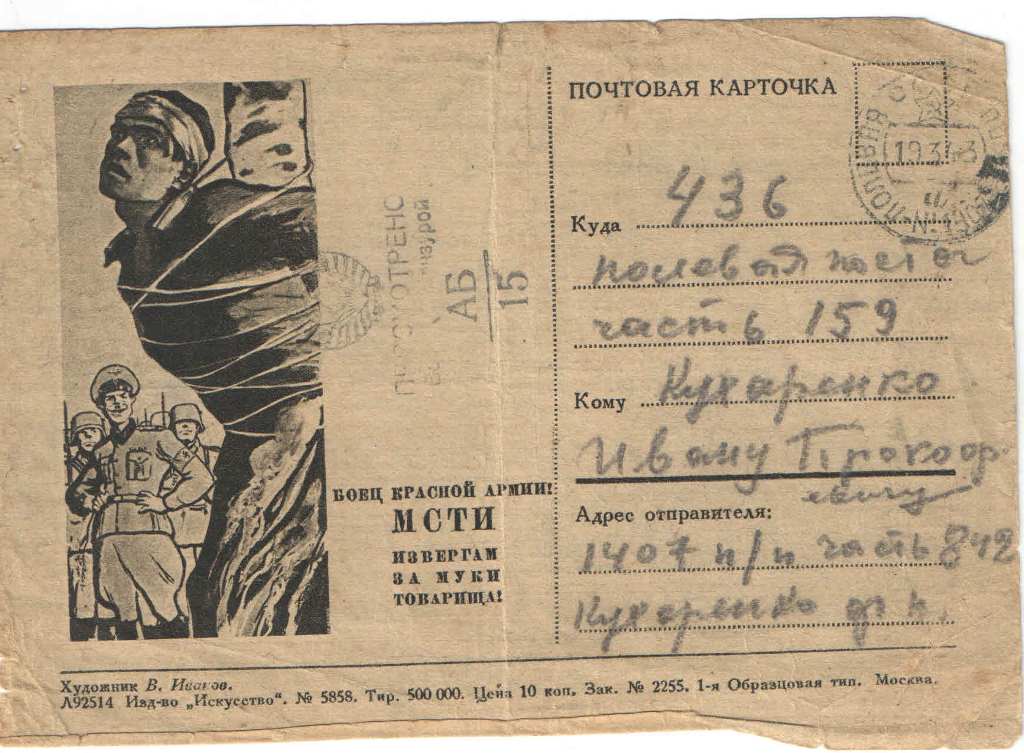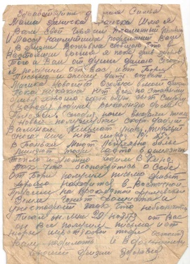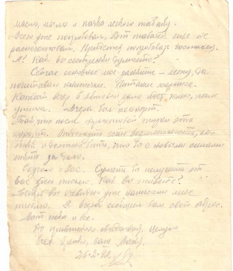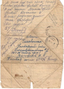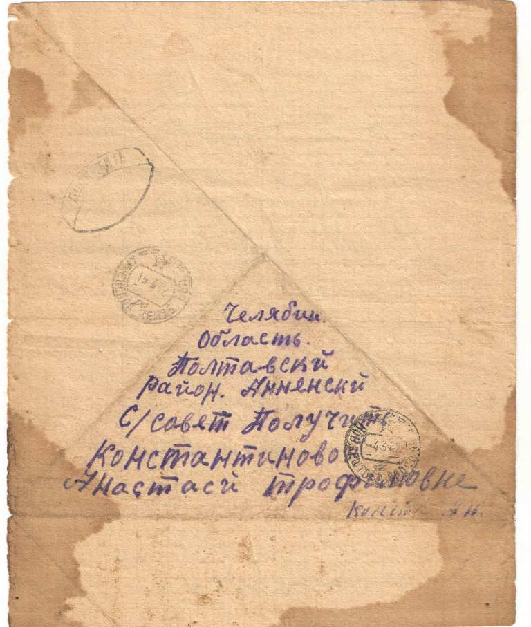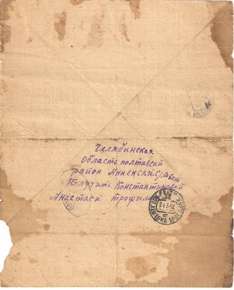 Писмо 1942 года 2 января Здравствуйте много уважаемое мое родное семейство вопервых строках моего писма спешу уведомить вас своем писмом освоем добром здрави Что я нахожусь жив и здоров Шлю я вам свое нижающе почтение и целую вас зао чно несколко раз Еще кланиюсь мами насти лени коли толинки примите от мине пламиныи привет моя жизень извесна какая унас стоят красно армеицы так и я нахожусь находимся все вместе Терентьев Толкачев Куцай толька в разных ротах взводах Лоня передай семе куцыва что онвместе сомной сам он писать неможет Настя как дела у тебя хотелось бы узнат кого еще взяли вармию одним словом все что есть нового не знай сколько будим стоят на мести или нет неизвесна Настя продукты уминя на исходи осталось только половина толчи приехать вам на верна непридеца к нам Настя передай почтения всем пахомову матрене филатову стебневу мой адрес. Сверловская область город Камышлов почтовый ящик №95 квартира №6 До свидание родные