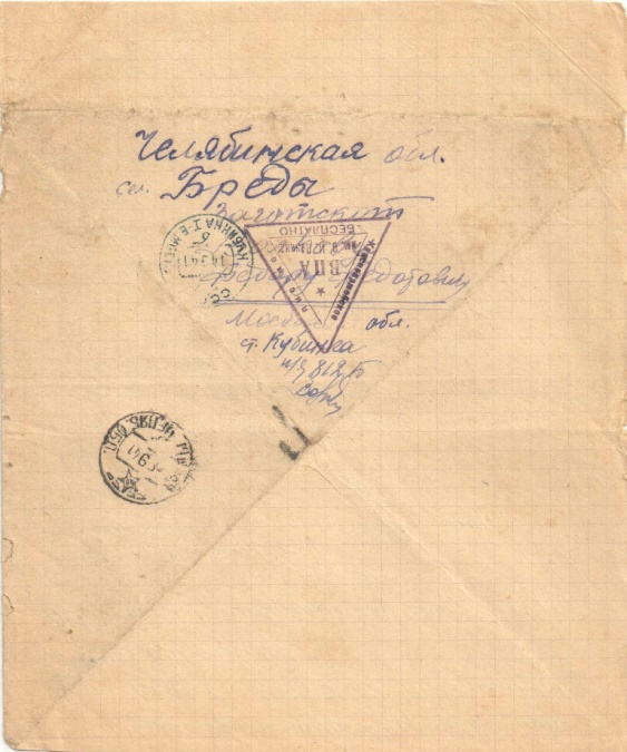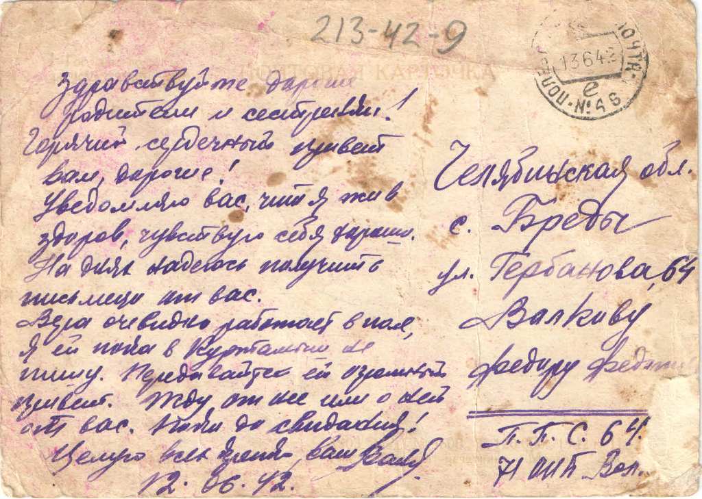 Здравствуйте дорогие родители и сестренки! Горячий сердечный привет вам, дорогие! Уведомляю вас, что я жив здоров, чувствую себя хорошо. На днях надеюсь получить письмецо от вас. Вера очевидно работает в поле, я ей пока в Куртамыш не пишу. Передавайте ей огромный привет. Жду, от нее или о ней от вас. Пока до свидания! Целую всех крепко, ваш Ваня.12.06.42. Челябинская обл. с. Бреды, ул. Гербанова 64 Волкову Федору Федотовичу П.П.С.64 71 ОПБ Вол.