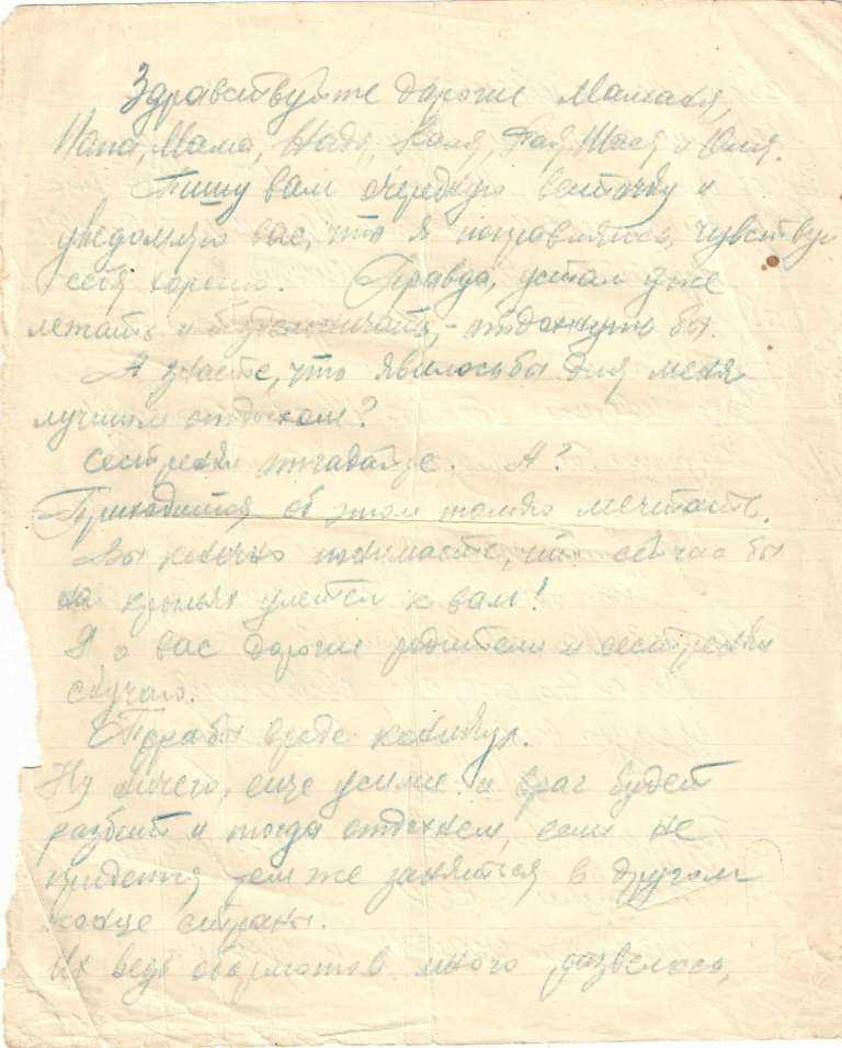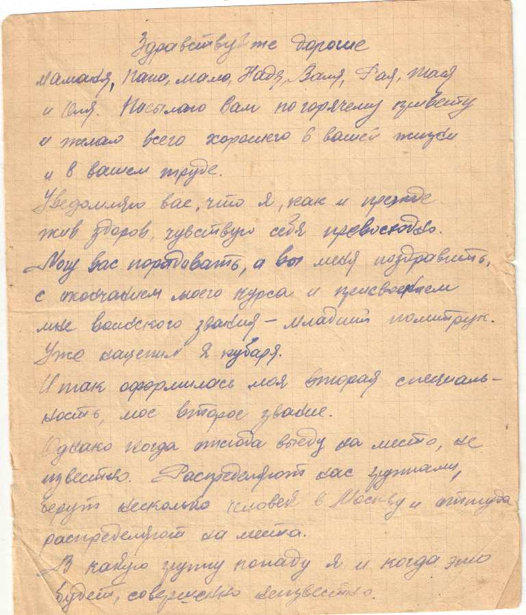 Здравствуйте дорогие маманя, папа, мама, Надя, Валя, Рая, Тася и Оля. Посылаю Вам по горячему привету и желаю всего хорошего в вашей жизни и в вашем труде.Уведомляю вас, что я, как и прежде жив здоров, чувствую себя превосходно. Могу вас порадовать, а вы меня поздравить, с окончанием моего курса и присвоением мне воинского звания – младший политрук. Уже нацепил я кубаря.