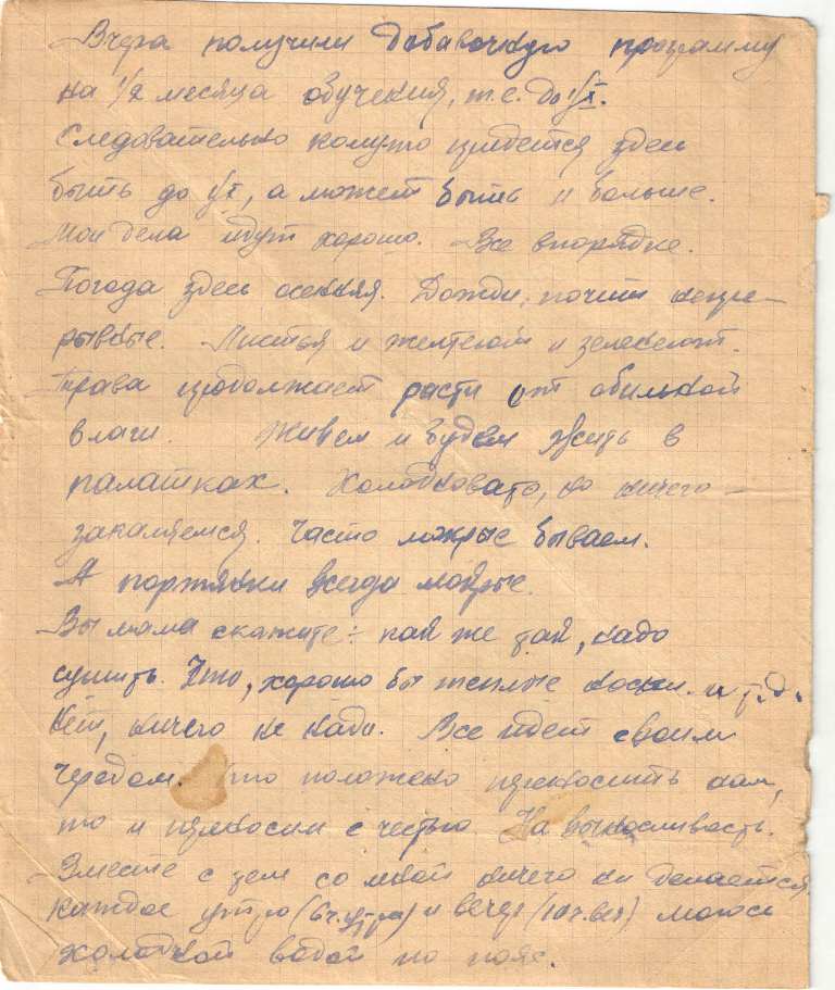 Вчера получил добавочную программу на ½ месяца обучения, т.е. до 1/x. Следовательно кому-то придется здесь быть до 1/x, а может быть и больше. Мои дела идут хорошо. Все в порядке. Погода здесь осенняя. Дожди, почти непрерывные. Листья и желтеют и зеленеют. Трава продолжает расти от обильной влаги. Живем и будем жить в палатках. Холодновато, но ничего закаляемся. Часто мокрые бываем. А портянки всегда мокрые. Вы мама скажите: как же так надо сушить. Что, хорошо бы теплые носки и т.д. Нет, ничего не надо. Все идет своим чередом. Что положено переносить нам, то и переносим с честью. На выносливость. Вместе с тем со мной ничего не делается. Каждое утро (6 ч.утра) и вечера (10ч. вечера) моюсь холодной водой по пояс.