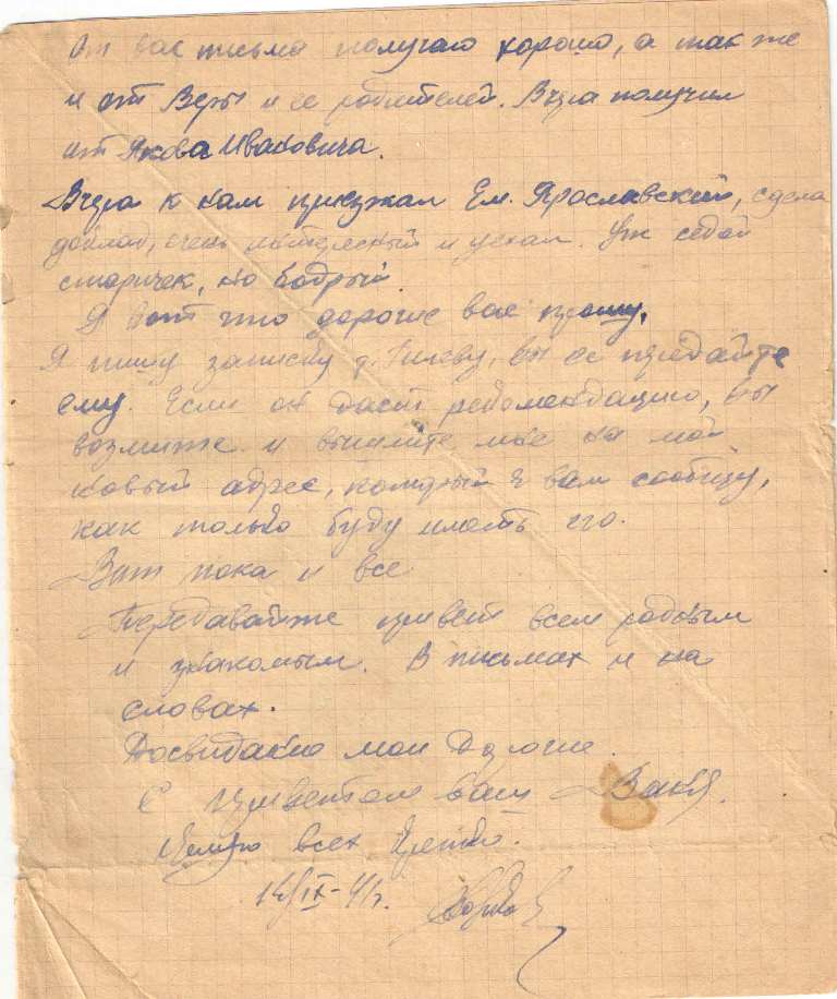 От вас письма получаю хорошо, а так же и от Веры и ее родителей. Вчера получил от Якова Ивановича.