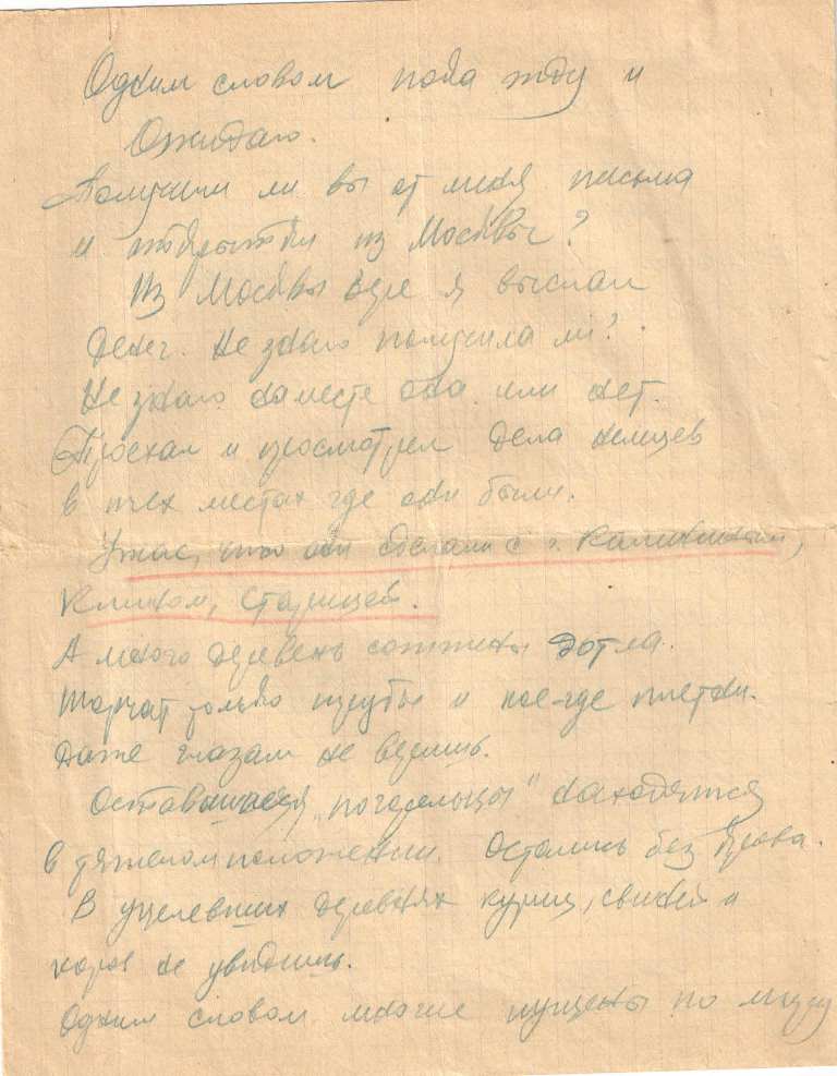 Из Москвы Вере я выслал денег. Не знаю получила ли? Не знаю на месте она или нет. Проехал и просмотрел дела немцев в тех местах где они были.