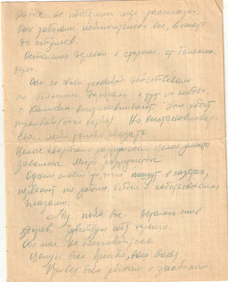 Одним словом то, что пишут в газетах, передают по радио, видел я собственными глазами. Ну пока все. Остаюсь жив здоров. Чувствую себя хорошо. Обо мне не беспокойтесь. Целую всех крепко, ваш Ваня.