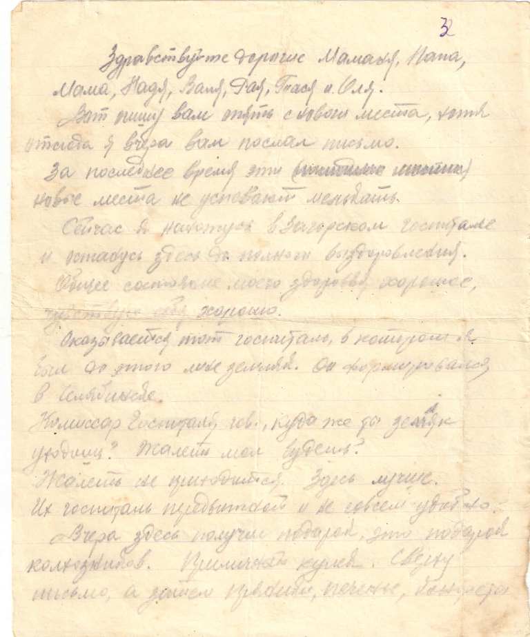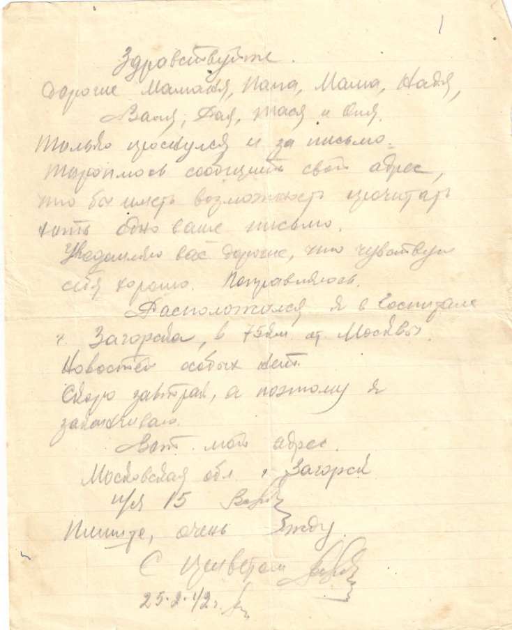 Только проснулся и за письмо. Тороплюсь сообщить свой адрес, чбо бы иметь возможность прочитать одно ваше письмо. Уведомляю вас дорогие, что чувствую себя хорошо. Поправляюсь. Расположился я в госпитале г.Загорска, в 75 км от Москвы. Новостей особых нет. Скоро завтракать, а поэтому я заканчиваю. Вот мой адрес. Московская область г Загорск п / я 15 (…) Пишите, очень жду. С приветом (…) 25.2.42 г.