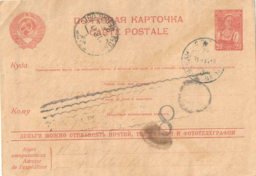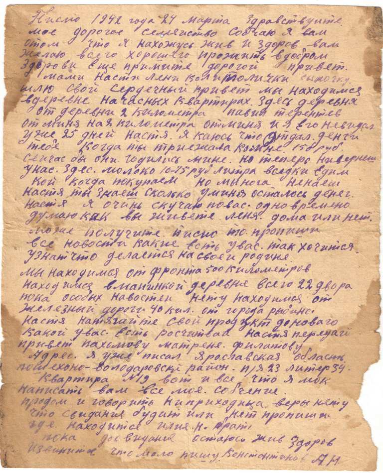 Писмо 1942 года 24 марта Здравствуйте мое дорогое семейство Собчаю я вам отом что я нахожусь жив и здоров вам желаю всего хорошего прожить в добром здорови Еще примите дорогой привет мами Насти Лени Коли Толички сыночку шлю свой сердечный привет мы находимся вдеревне на часных квартирах. Здесь деревня от деревни 2 километра Павил Терентьев от миня на 2 километра отминя и я его невидал уже 25 дней Настя. Я каюсь что отдал. денги тебе когда ты триежала комне. 150 руб. Сеичас бы они годились мине. Но теперь нивернеш у нас. Здес. Молоко 10-15 руб литра вседки Едим кой когда покупаем но мынога ненаеш Настя ты знаеш сколько у миня осталось денег. Настя я очинь скучаю повас. Одно времено думаю как вы живете леня. дома или нет. може получите. писно то пропиши все новости какие есть у вас. так хочится. Узнат что делается на своей родине. Мы находимся от фронта 500 километров находимся вманинкой деревня всего 22 двора пока особых новостей нету находимся от железный дороги 40 кил. От города рыбинс. Настя натягайте свой продукт доноваго какой увас. Есть росчитвай Настя передай привет пахомову матрене. Филатову Адрес. Я уже писал Ярославская область. Пошехоно-володаровскй район. п/я 23 литер 34. Квартира №19 вот и все что я мок написать вам все мое. собчение. придом и говорить ниприходица. веры нету что свидание будит или нет пропиши. где находится илия н. брат пока дос видани остаюсь жив здоров Извините что мало пишу. Константинов А Н.