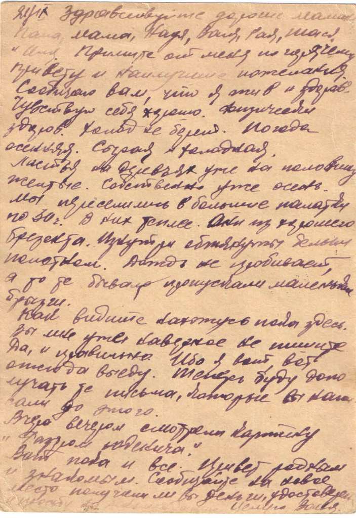 Здравствуйте дорогие маманя, папа, мама, Надя, Валя, Рая, Тася и Аня. Примите от меня по горячему привету и наилучшие пожелания. Сообщаю вам, что я жив и здоров. Чувствую себя хорошо. Физически здоров. Холод не берет. Погода осенняя. Сырая и холодная. Листья на деревьях уже наполовину желтые. Собственно уже осень. Мы переселились в большие палатки по 30 чел. В них тепло. Они из хорошего брезента. Изнутри обтянуты белым полотном. Дождь не пробивает, а то те бывало пропускали маленькие брызги. Как видите нахожусь пока здесь. Вы мне уже наверное не пишите. Да, и правильно ибо я вот, вот отсюда выеду. Теперь буду дополучать те письма, которые вы написали до этого. Вчера вечером смотрели картину «Разгром Юденича». Вот пока и все. Привет родным и знакомым. Сообщайте на новое место получили ли вы деньги, удостоверение и просьбу за рекомендацию. Целую Ваня.