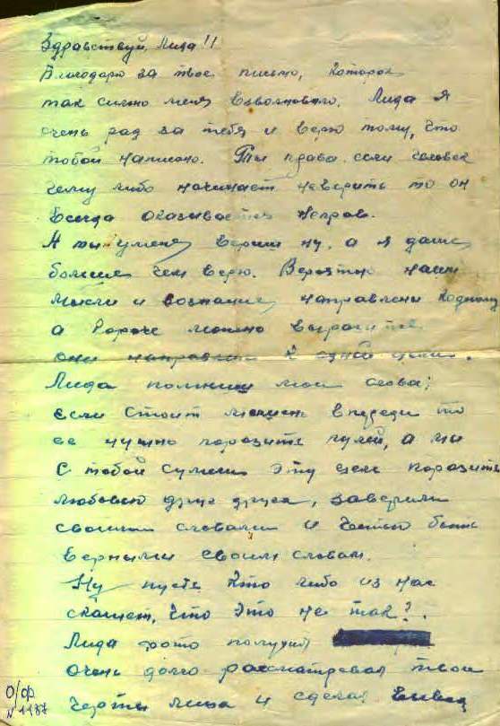 Здравствуй, Лида! Благодарю за твое письмо, которое так сильно меня взволновало. Лида я очень рад за тебя и верю тому, что тобой написано. Ты права, если человек начинает чему-либо не верить, то он всегда оказывается неправ. А ты у меня веришь, ну а я даже больше чем верю. Вероятно наши мысли и сознание направлены в одну, а короче можно выразиться они направлены к одной цели. Лида помнишь мои слова: если стоит мишень впереди, то её нужно поразить пулей, а мы с тобой сумеем эту цель поразить любовью друг друга, заверили своими словами и честно быть верными своим словам. Ну пусть кто либо из нас скажет, что это не так? Лида фото получил очень долго рассматривал твои черты лица и сделал вывод (…) это то, что ещё больше полюбил и ты для меня стала больше чем жена или друг моей жизни.