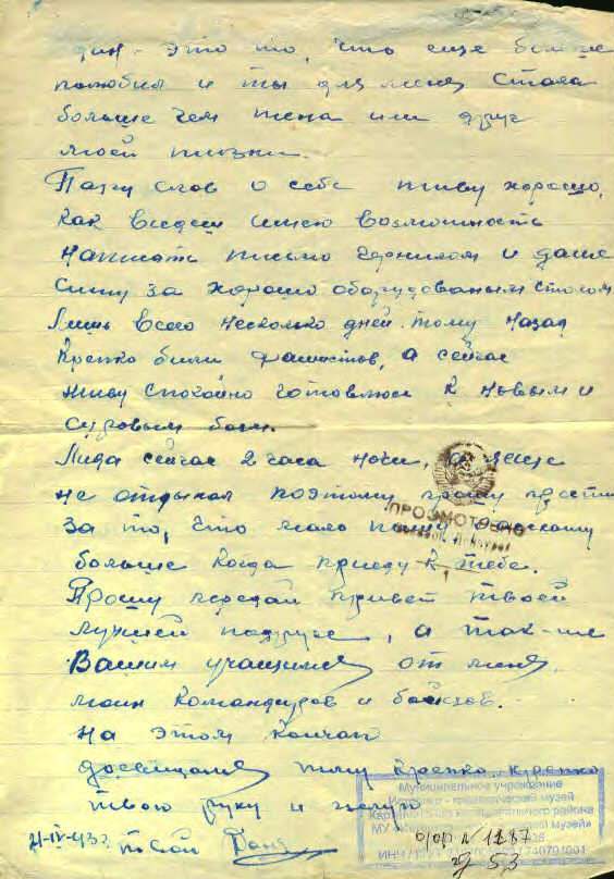 Пару слов о себе живу хорошо, как видишь имею возможность написать письмо чернилом и даже сижу за хорошо оборудованным столом. Лишь всего несколько дней назад крепко били фашистов, а сейчас живу спокойно готовлюсь к новым и суровым боям. Лида сейчас 2 часа ночи, а я ещё не отдыхал поэтому прошу прости за то, что мало пишу (…) больше когда приеду к тебе. Прошу передай привет твоей лучшей подруге, а также Вашим учащимся от меня моих командиров и бойцов. На этом кончаю. Досвидания жму крепко крепко твою руку и целую. Твой Даня. 21.04.43 г.