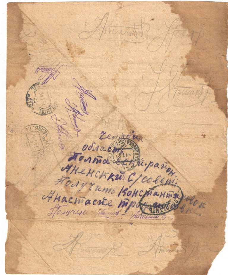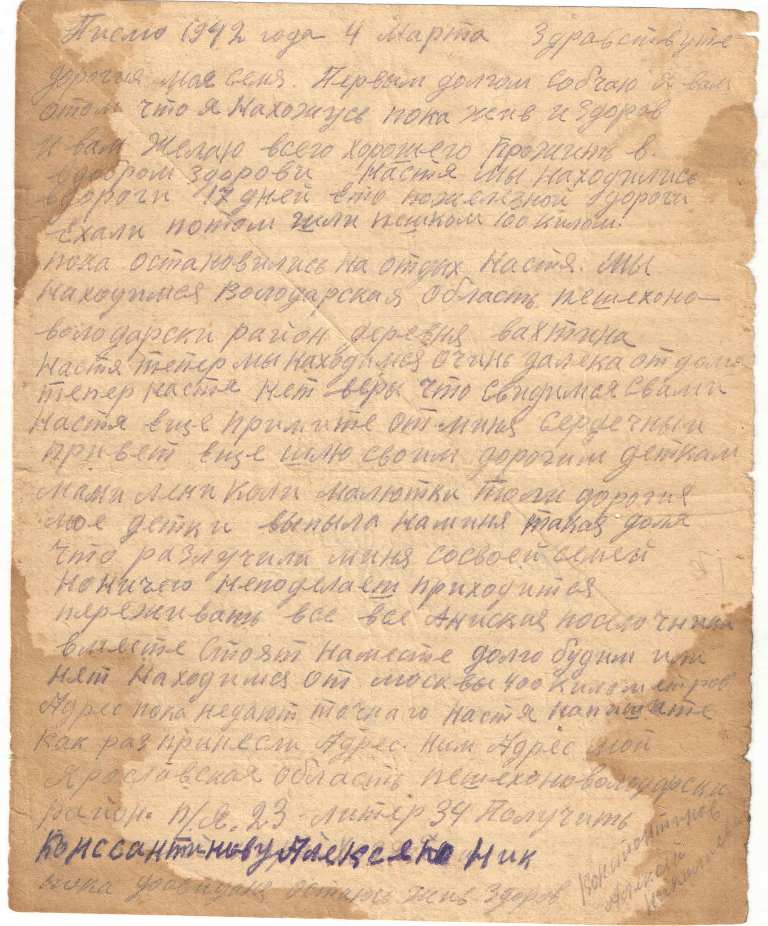 Писмо 1942 года 4 марта Здравствуйте дорогия мая семя. Первым долгом собчаю я вам отом что я нахожусь пока жив и здоров и вам желаю всего хорошего прожить в. вдобром здорови Настя мы находились вдороги 17 дней ето пожелезной дороги ехали потом шли пешком 100 килом. Пока остановились на отдых Настя. Мы находимся Володарская область пешехоно-володарски район деревня вахтина Настя тепер мы находимся очинь далека от дома тепер Настя нет веры что свидимся свами Настя еще примите от миня сердечный привет еще шлю своим дорогим деткам Мани Лени Коли Малютки Толи дорогие мое детки выпыла наминя такая доля что разлучила миня сосвоей семей ноничего неподелаеш приходится переживать все все все Аниские поселочники вместе стоят наместе долго будим или нет Находимся от москвы 400 километров Адрес пока недают точнаго Настя напишите Как раз принесли Адрес Нам Адрес мой Ярославская область пешехоноволодарский район. п/я 23 литер 34 Получать Конссантинову Алексею Ник пока досвидане остаюсь жив здоров