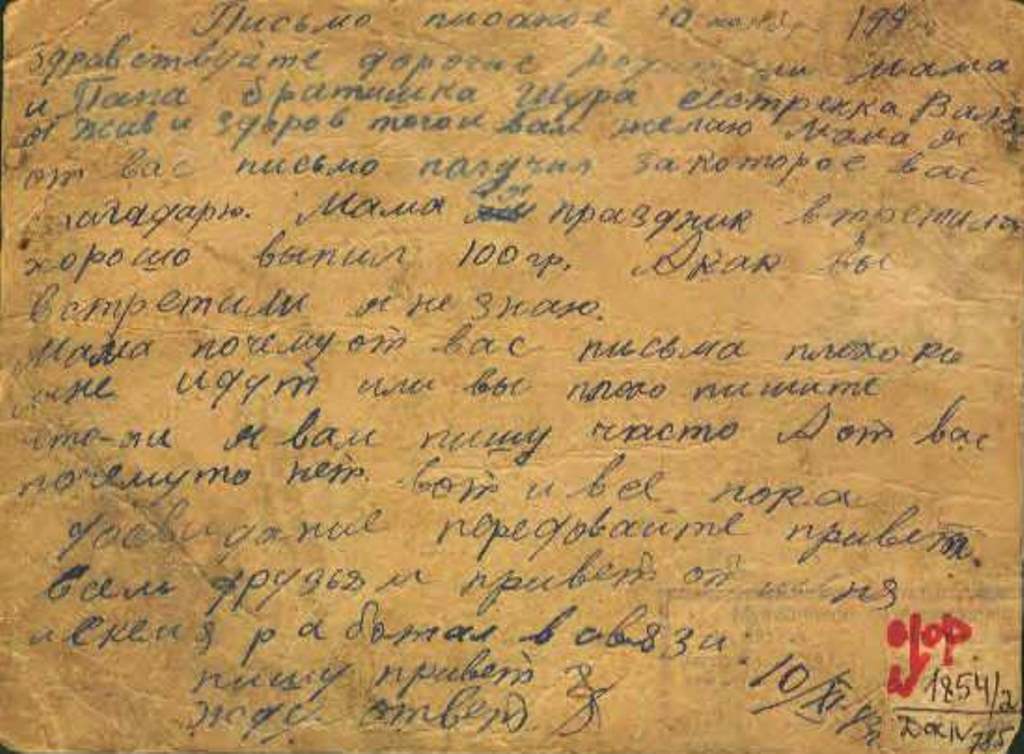 Здравствуйте дорогие родители Мама и Папа братишка Шура сестренка Валя Я жив и здоров того и вам желаю Мама я от вас письмо получил за которое вас благадарю. Мама праздник встретили хорошо выпил 100 гр. А как вы встретили я не знаю. Мама почему от вас письма плохо ко мне идут или вы плохо пишите что-ли Я вам пишу часто А от вас почемуто нет. вот и все пока досвидание передовайте привет. всем друзьям привет от меня и с кем работал в связи: пишу привет жду ответ. I0/XI-43г.