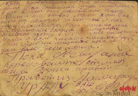 ..4.44г. Здравствуйте дорогие родители Мама Папа братишка Шура и сестренка Валя Добрый день веселый час Пишу письмо и жду от вас Мама я от вас письма получал за которые я вас очень благадарю. Мам письма мне на госпиталь больше не пишите я сейчас ухожу в часть уже вылечин Мама я вам писать письма буду а вы мне не пишите пока не дам вам своего адреса. Пока досвидания передовайте от меня своим друзьям привет Привет из Ленинграда УРА-ЛУ ВАШ сын Федор