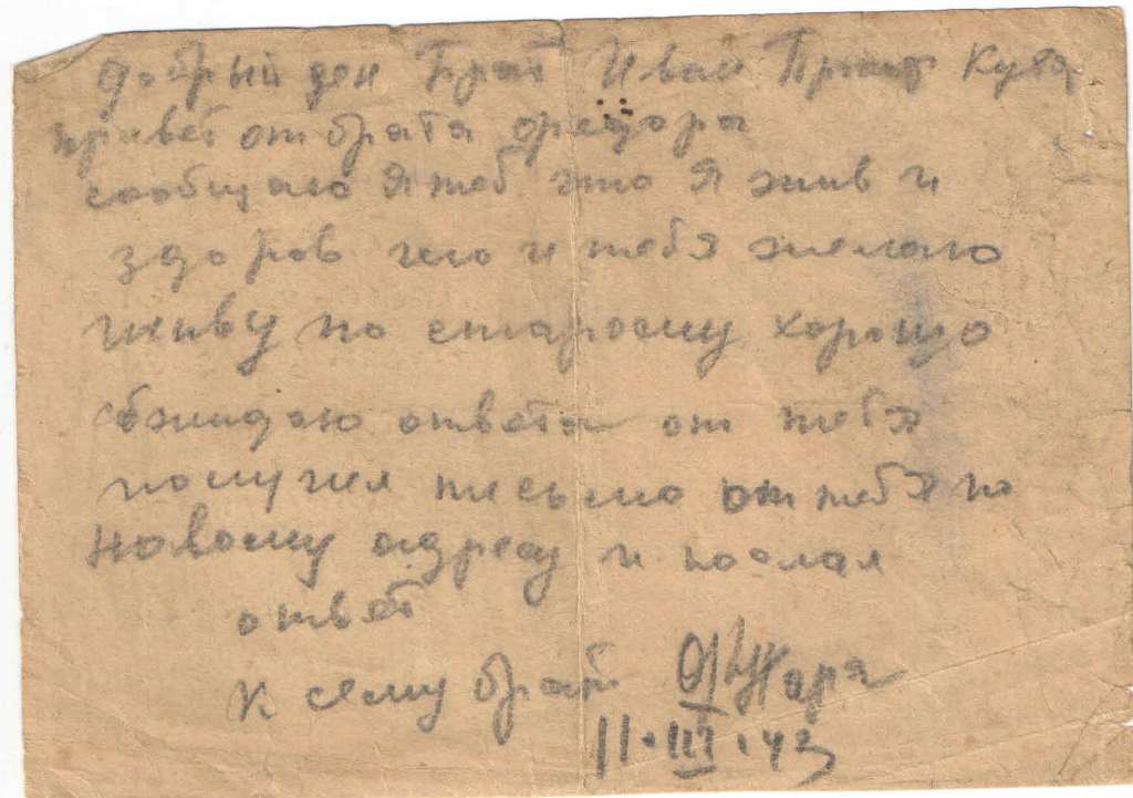 Добрый ден Брат Иван Прокоф Кухар привет от брата федора сообщаю я теб что я жив и здоров чего и тебя желаю живу по старому хорошо ожидаю ответа от тебя получил письмо от тебя по новому адресу и послал ответ К сему брат (роспись)