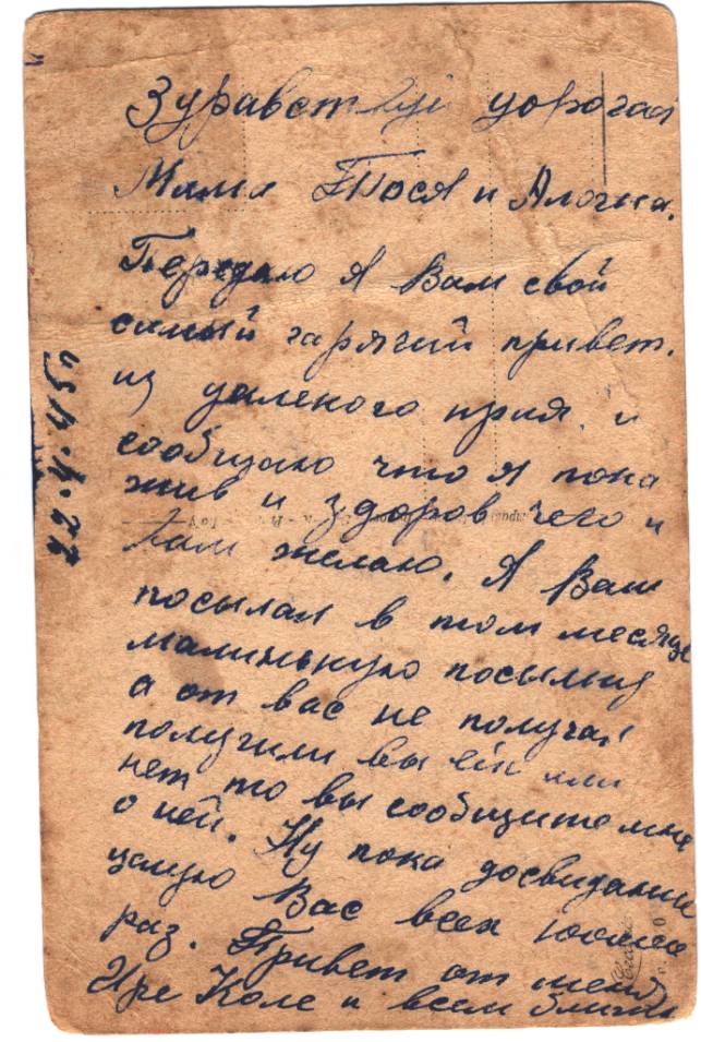 Здравствуй дорогая Мама Тося и Алочка. Передаю я Вам свой самый гарячий привет из далекого края и сообщаю что я пока жив и здоров чего и вам желаю. Я Вам посылал в том месяце малинькую посылку а от вас не получал. Получили вы её или нет то вы сообщите мне о ней. Ну пока досвидание. Целую Вас всех 100000 раз. Привет от меня Ире Коле и всем ближа.