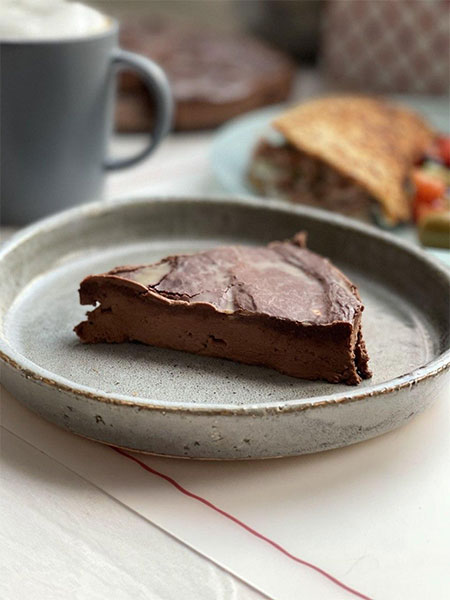 Спустя два часа нагреть сливки (можно использовать тот же сотейник, в котором растапливался шоколад) и растопить в них 90 г шоколада. Помешивать, чтобы не закипело. Вылить поверх схватившейся массы и снова убрать в холодильник, пока шоколад не застынет. Готово!
