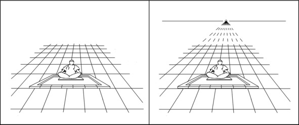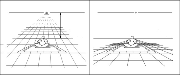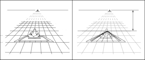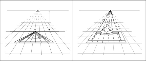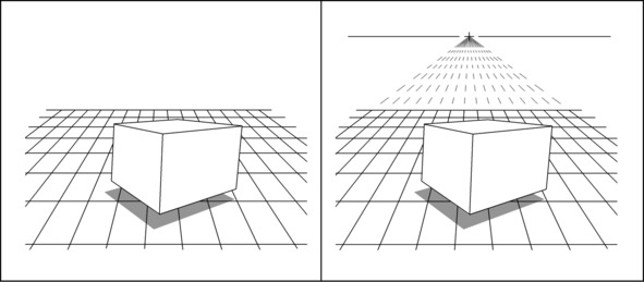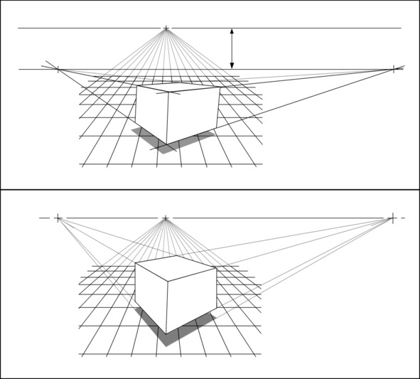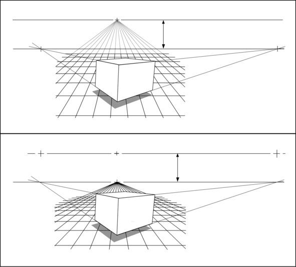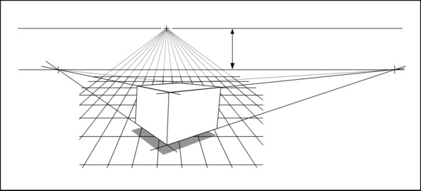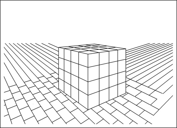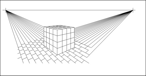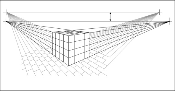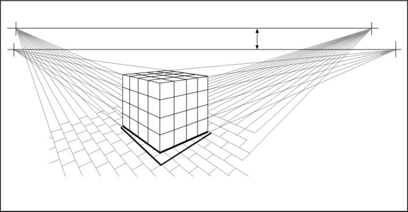 The cube is drawn on a rectangular paving slab. Continuing the seams of the tiles, we find the horizon line of this site. Tile seams intersect at the site’s skyline.