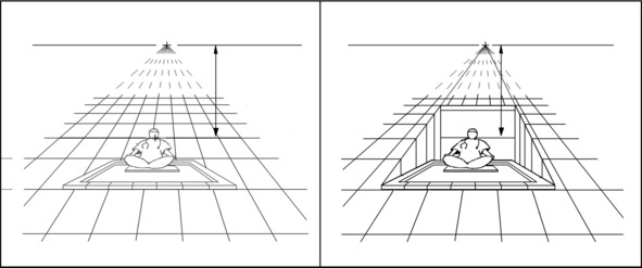 A possible version of the picture with a dip (pit) in the plates. In a dip, behind a person’s back, one can see his own horizon of this drawing. The pool is located in a dip, very peculiar. The pool side closest to us lies at the site level, and the far (rear) side of the pool lie well below the site level.