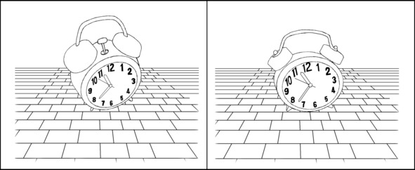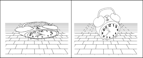 Даже в этом случае не получается правильной, нормальной перспективы (геометрии) рисунка. Часы как будто стоят на одной левой (для нас) ножке и наклонены, падают в сторону зрителя.