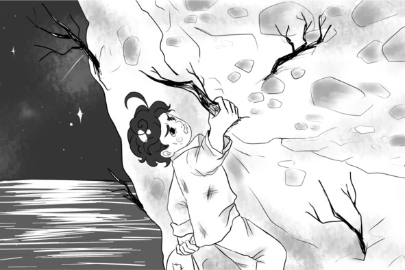 Подъём оказался тяжёлым испытанием: сандалии были не по размеру, ноги в них бултыхались, из-за чего часто соскальзывали вниз. Каждый раз меняя угол подъёма, гора как будто сама возвращала Филиппа на прежнее место и магнитом тянула к склону. Как они не пытались идти наискосок, путь всё равно пролегал через обезображенные ели.