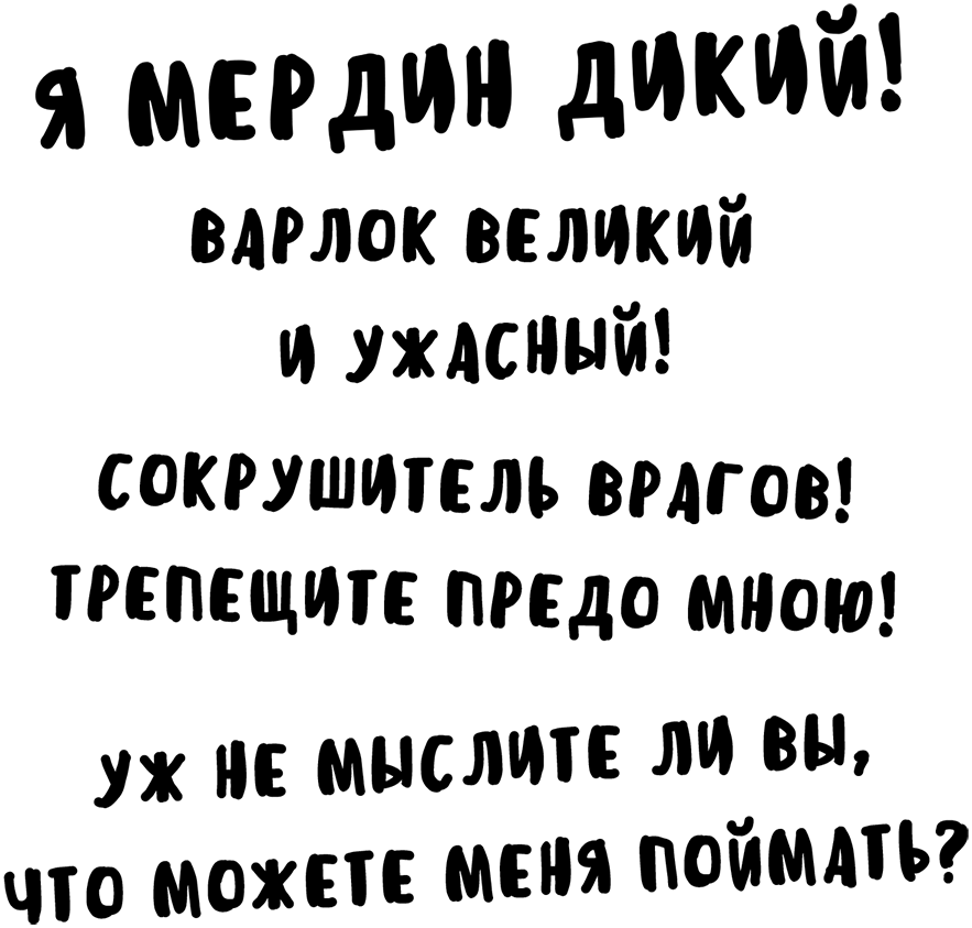 По толпе пронёсся вздох, когда обвиняемый поднялся, но не встал! Он остался сидеть со скрещёнными ногами и парил теперь в двух метрах над землёй. Его цепи, обмотанные вокруг огромного валуна, натянулись, издав леденящий душу звук ЗВЯК! Злоумышленник покачивался на цепях, как человекоподобный воздушный шарик: глаза закрыты, а по грязному лицу блуждает шкодливая улыбка, как у школьника, который знает, что поступил неправильно, но которому всё равно. Вот он, герой – или лучше сказать антигерой? – нашей истории. Как его зовут? Это вовсе не секрет – его зовут Мердин Дикий.