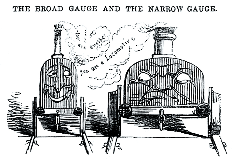 ‘Gauge War’: an 1845 cartoon by Angus Reach on the conflict between the broad gauge of the Great Western Railway and the narrow gauge.