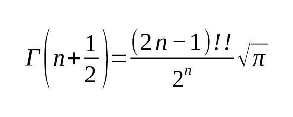 Это показывает прямую связь между чётными степенями интеграла Гаусса и значениями гамма-функции, и объясняет, почему значения при полуцелых аргументах выражаются через $ \sqrt {\pi} $ [1] [2].