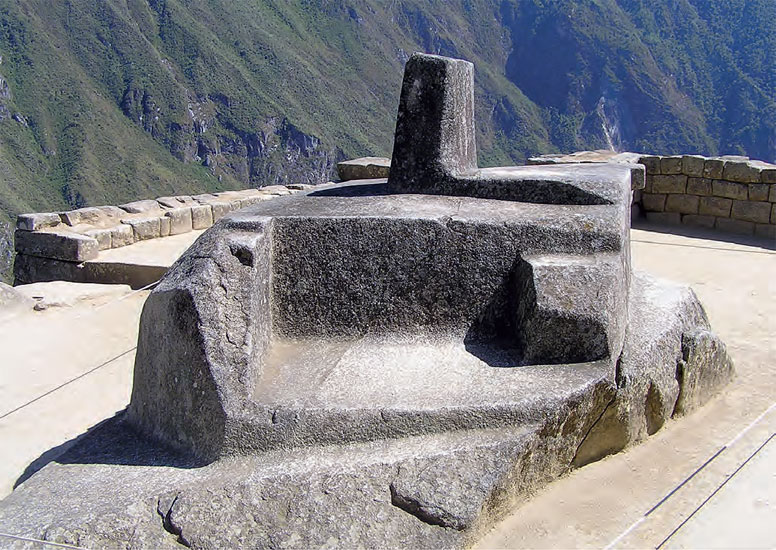 На площади, выложенной плоскими камнями, на пирамидальном основании лежит громадный монолит Интиуатана, что в переводе означает место, куда прикреплено Солнце. Его четыре угла указывают направление четырёх сторон света. Монолит имеет довольно мудрёную ступенчатую форму с прямоугольным столбом посреди, выполняющим роль солнечных часов. А на самой широкой ступени совершались жертвоприношения.