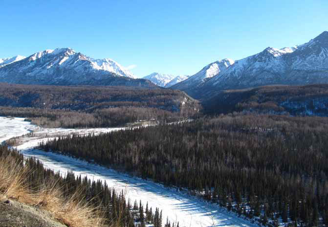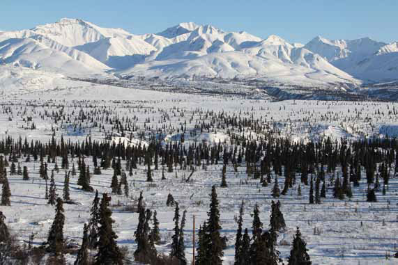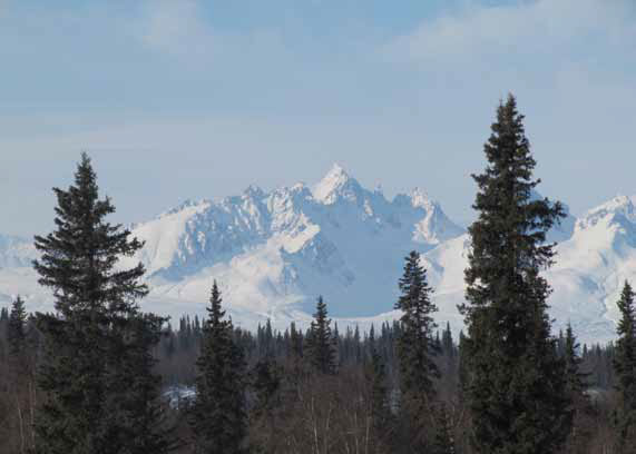 Через километров пятьдесят над тёмно-зелёной лентой леса проклюнулись заснеженные зубцы, сияющие на солнце девственной белизной. Вырастая на глазах, они превратились во внушительный горный массив, тянущийся с юга на север. После унылой монотонности равнины этот величественный хаос остроглавых пиков произвёл на меня особенно сильное впечатление. Вдали, на севере, проступала сквозь голубую дымку грозная конусовидная громада Мак-Кинли – самая высокая гора континента (6194 м). Дирекция национального парка обещала открыть доступ к ней не ранее третьей декады апреля, возможно, даже в мае, – всё зависит от того, какой будет весна. Обидно. Мы не можем так долго ждать.