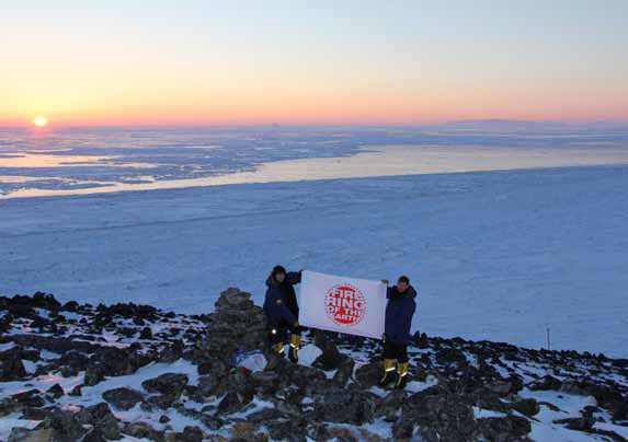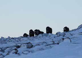 Как ни хотелось подольше насладиться покоем и скупыми, хрупкими красотами севера, подступающие сумерки и усиливающийся мороз побуждали к спуску. Но прежде следовало установить флаги России и РГО на столь знаковой точке. Увлёкшись этим ответственным делом, мы не сразу заметили, что из-за гряды скал за нами внимательно наблюдают заросшие шерстью, свисавшей густыми космами до самой земли, овцебыки. Их угрожающие позы и угрюмое выражение морд красноречиво свидетельствовали о нежелательности нашего присутствия на принадлежащей им территории. Благоразумно обойдя стадо стороной, мы поспешили в лагерь.